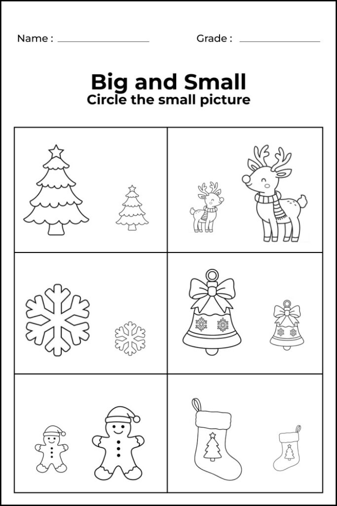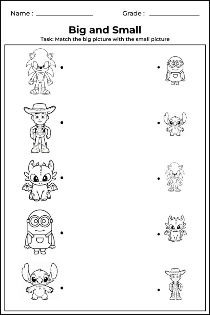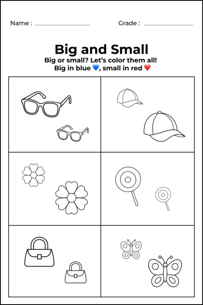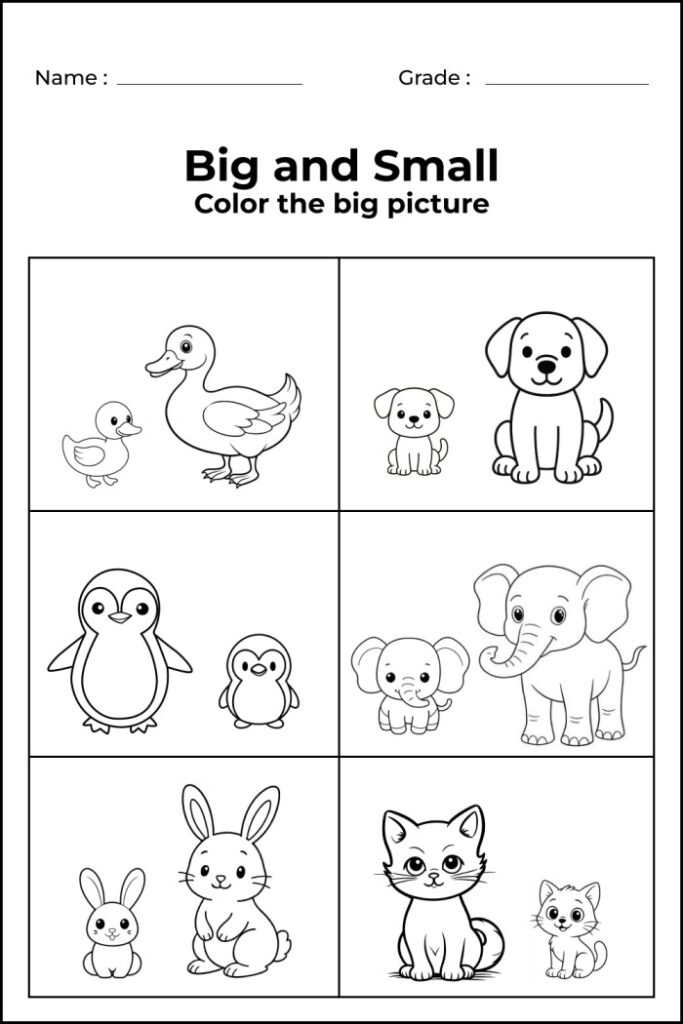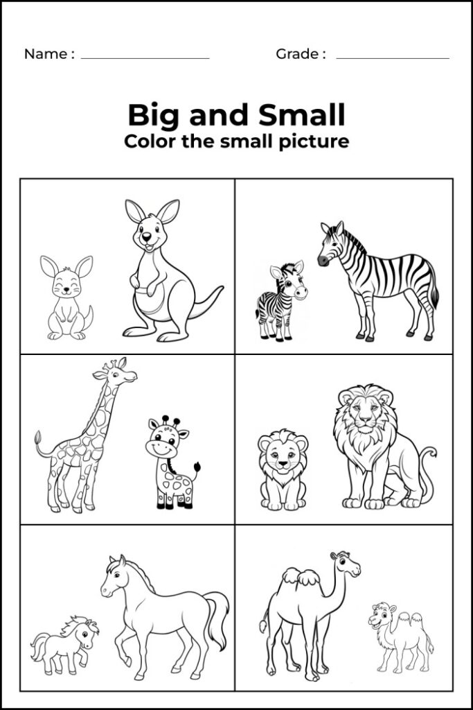 To help children clearly understand the difference between big and small, I have created 7 engaging worksheets that focus on coloring, circling, matching, and size recognition. These worksheets are specifically designed for preschool, kindergarten, and early learners.