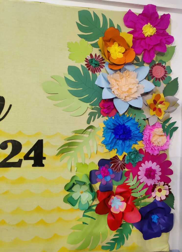 The Orientation Day backdrop was the highlight of the entire decor. It was designed to create a 3-dimensional effect using craft paper flowers, colorful cutouts, tropical leaves, and layered arrangements.